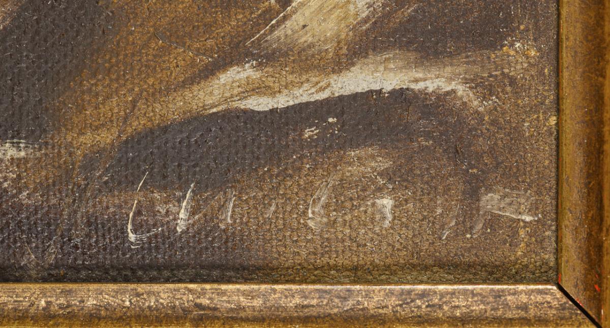 Öl/Leinwand/Karton. Rechts unten undeutlich signiert, verso bezeichnet. Undeutlich datiert: (19)45?.
