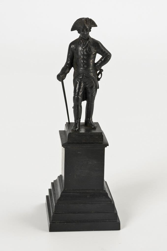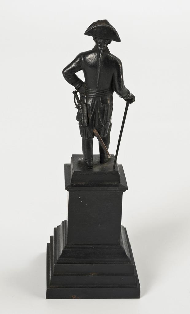 Standbild des "Alter Fritz" genannten Königs von Preußen in Uniform auf hohem Sockel. Entwurf wohl von August Kiss in Anlehnung an Schadow bzw. Rauch.