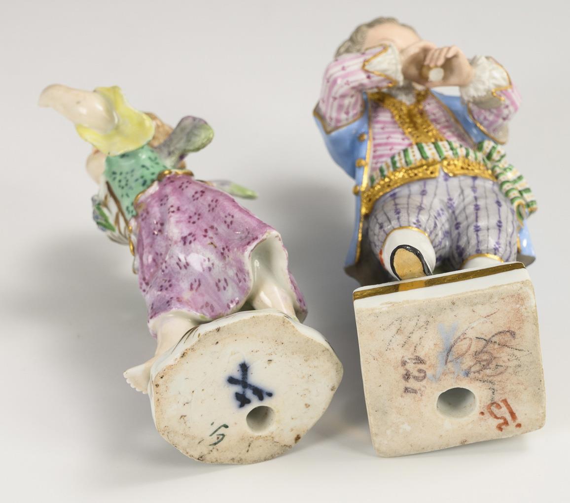 1x Amorette als Tänzerin: Schwertermarke, 2. H. 18. Jh., Modell-Nr. 2x, Entwurf 1750/55 von Johann Joachim Kaendler (1706-1775). / 1x Gärtnerknabe mit Flöte: Knaufschwerter, 1850-1924, 1. Wahl, Modell-Nr. G 9, Entwurf 1778 von Michel Victor Acier (1736-1799). 1 Flügel und Kopf der Amorette restauriert, Flöte des Knaben bestoßen.