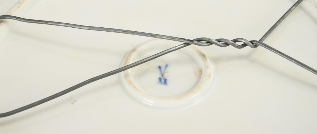Polychrom bemalt, goldstaffiert. 2 Vasen (H 25 cm), 1 Fächerplatte (Ø 28,5 cm).
