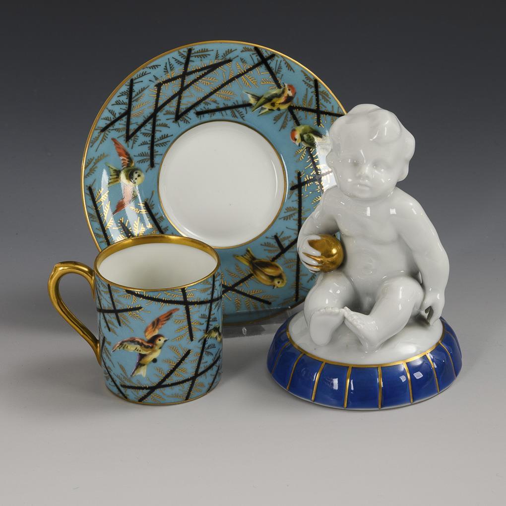 1x "Knabe mit Ball", Entwurf von Carl Nacke (1876-1931): auf einem gewölbten Sockel sitzender Knabe mit goldenem Ball (H 10,5 cm). / 1x Mokkatasse (H 5 cm) mit originaler Untertasse (Ø 12 cm): hellblauer Fond mit Vogelmalerei und Goldstaffage.
