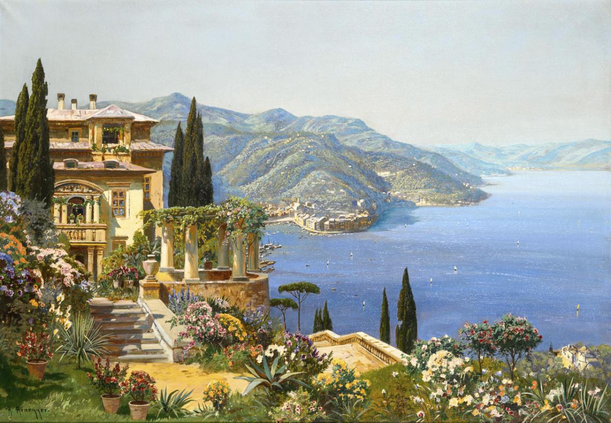 Blick vom blühenden Garten einer Villa weit oberhalb des Sees in die weite, grüne Berglandschaft unter blauem Himmel.