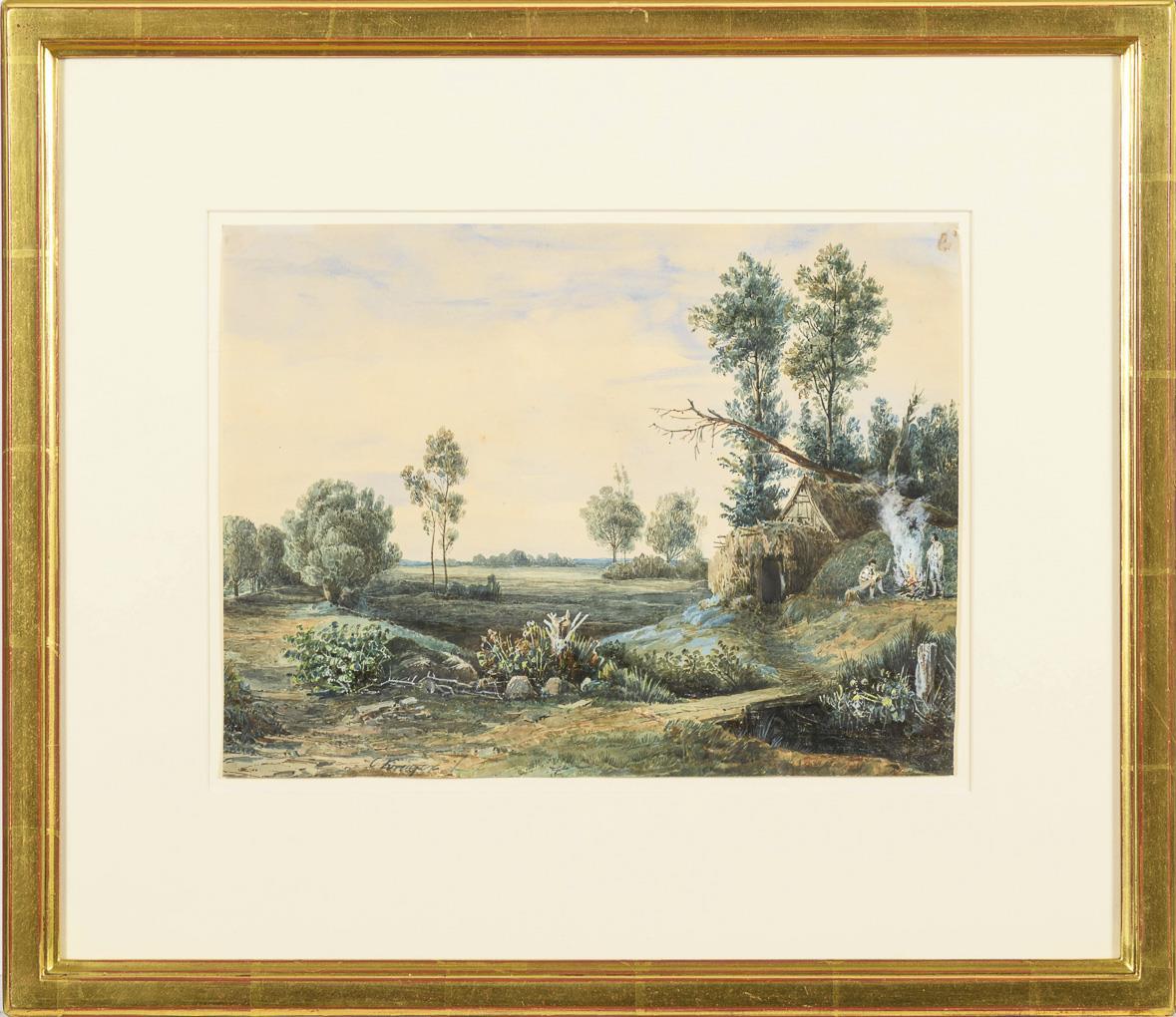 Staffagefiguren vor der Kate mit Blick in die Ebene unter leicht bedecktem Himmel. Kleiner Riss am Rand, Altersspuren.