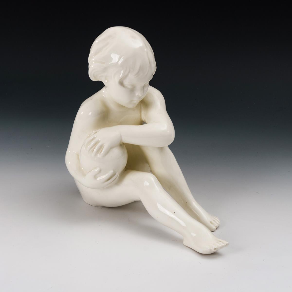 Auf dem Boden sitzende Kinderfigur mit Ball. Meist produzierte Figur der Bildhauerin für die Firma Roesler.