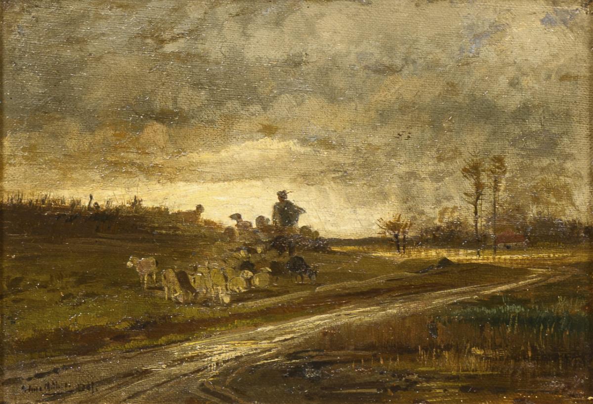 Weite Landschaft mit herbstlichen Bäumen und Hirte mit Herde unter bedecktem Himmel. Altersspuren.