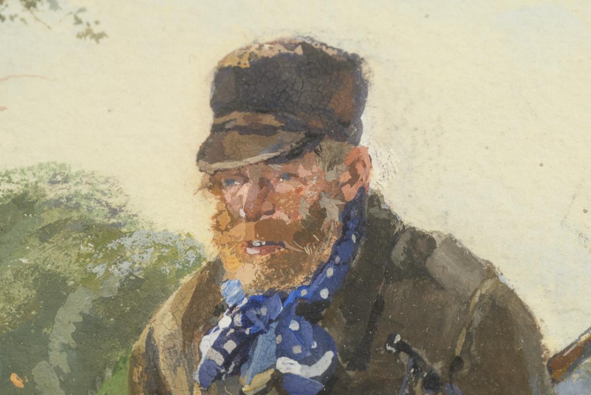 Zwei ältere Jäger am Feuer im Sonnenschein nahe den Kühen.
