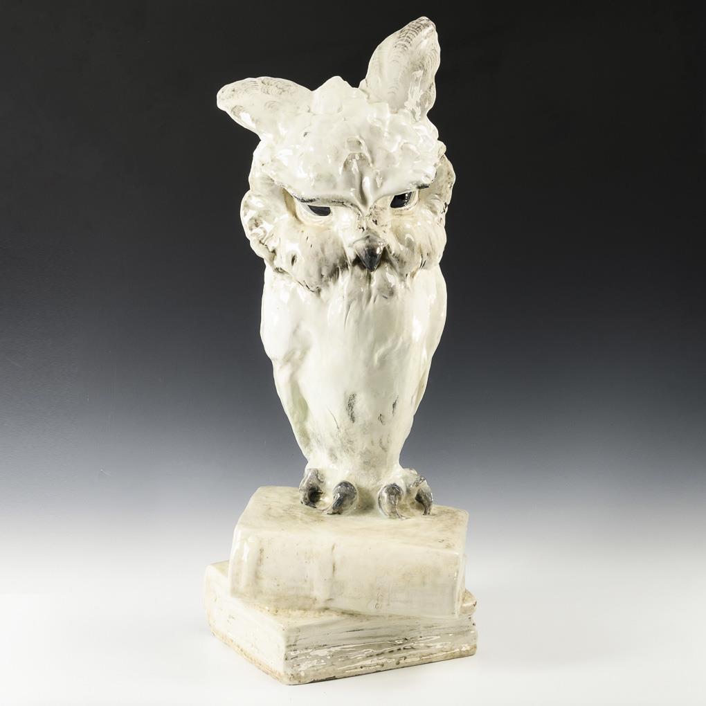 Außergewöhnlich großer Uhu auf Bücherstapel. A. Förster & Co., Wien.