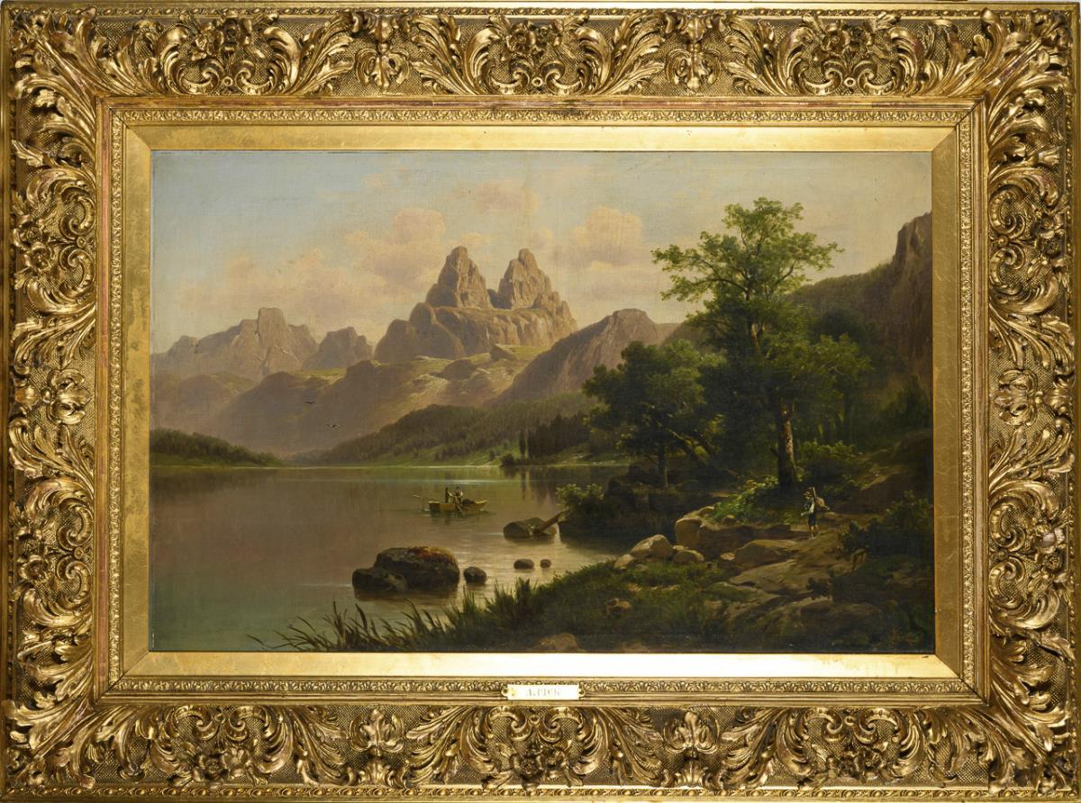Gebirgslandschaft im prunkvollen Goldstuckrahmen