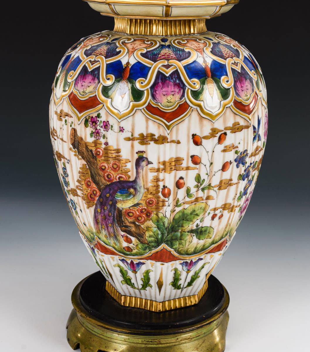 Dekorativ gestaltete Balusterform mit teils gerippter Wandung und Ornamentrelief auf der Schulter. Messingfuß und -schaft. Ohne Schirm. Minimaler Goldabrieb, Messingfuß etwas verbogen.