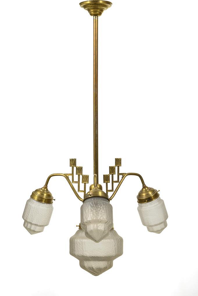 Sie befinden sich hier: Startseite Kategorien Lampen und Beleuchtung 4-flammige Jugendstil-Deckenlampe mit rhombenförmigen Schirmen