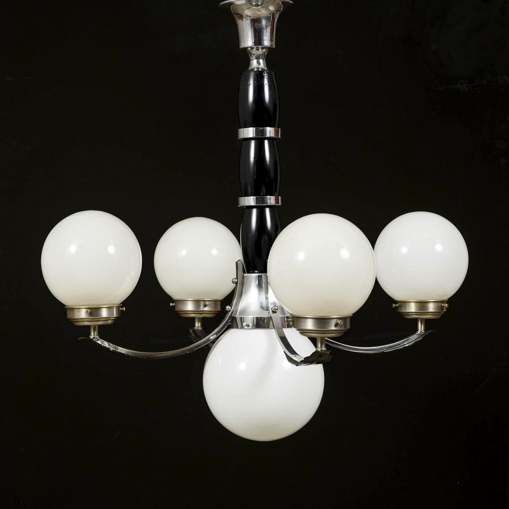 Säulenförmiger Zentralschaft im Kontrast von Schwarz und Silber sowie abgehängter großer Zentral-Kugelschirm. An den 4 Bogenarmen mit schwarzem Blattbesatz stehend montierte Kugelschirme. Funktion nicht geprüft.