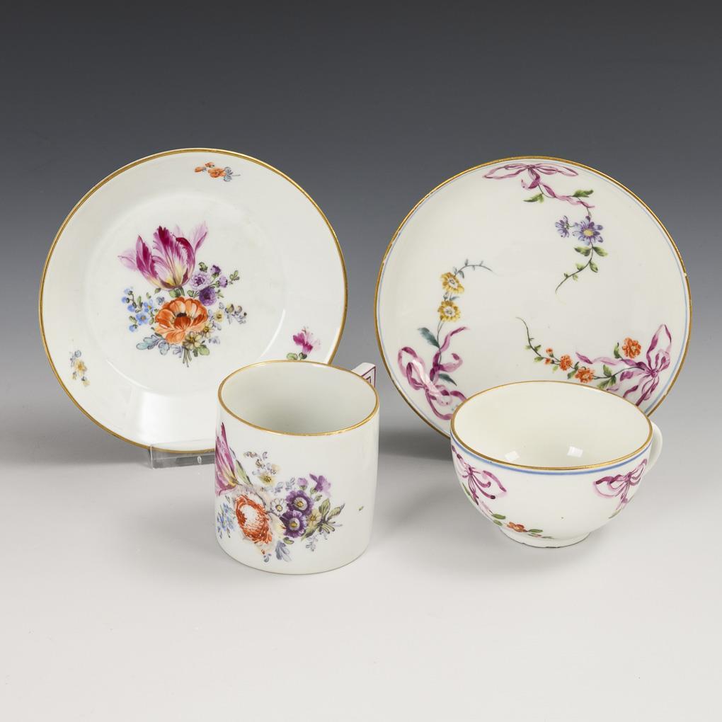 1x Schwertermarke mit Punkt, 1763-1774: bauchige Tasse mit Ohrenhenkel und schleifenbekrönten Blumenfestons (H Tasse 4,5 cm, Ø originale Untertasse 13,5 cm). / 1x Knaufschwerter mit grünem Beizeichen "I", 1816-1824: Zylindertasse mit gewinkeltem Henkel und einem schauseitigen Blumenbukett (H Tasse 6,5 cm, Ø originale Untertasse 13,5 cm). 1x minimaler Goldabrieb und kleine Bestoßungen am Standring der Tasse.