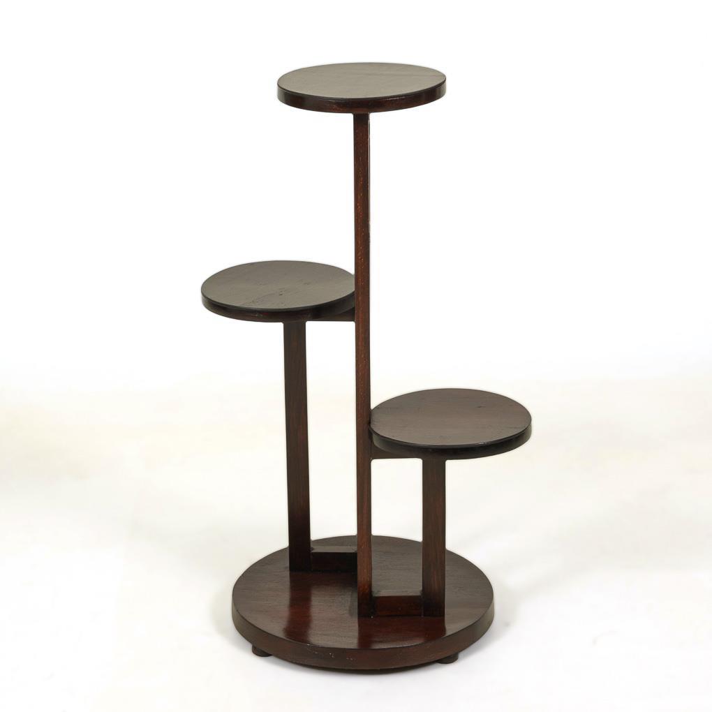 Gestell mit 3 runden Ablageflächen auf 3 geraden Vierkantstreben, Rundsockel mit 4 Scheibenfüßchen.