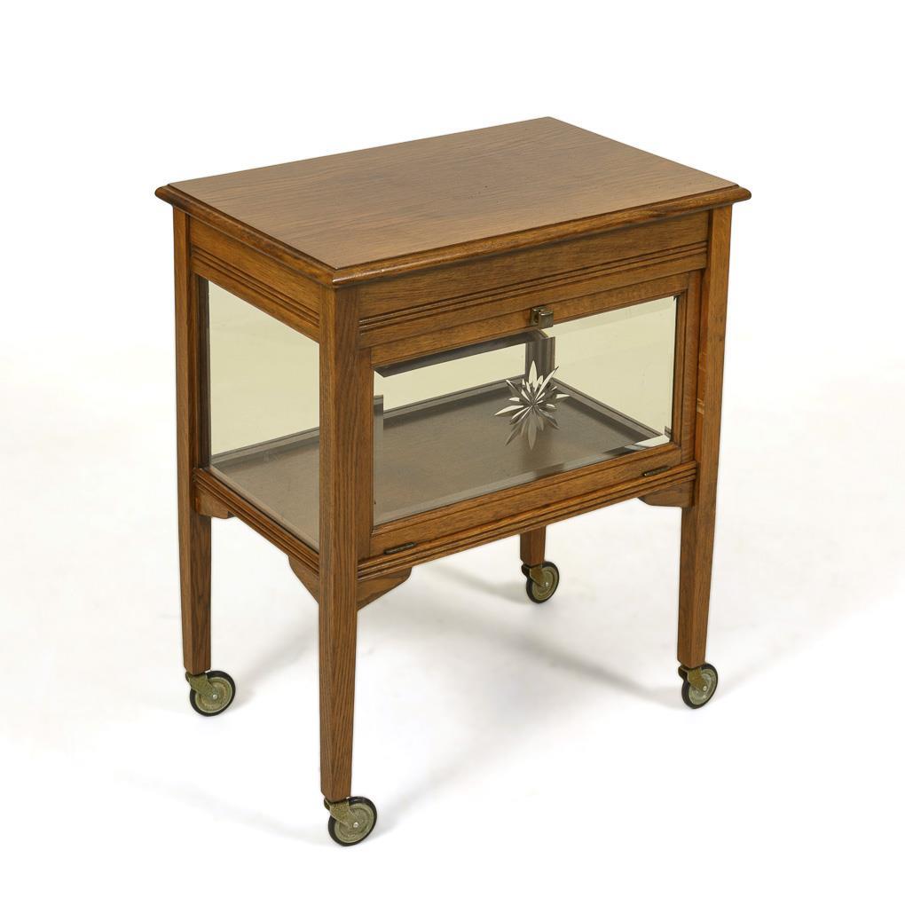 4-seitig verglaster Korpus mit Profilkanten, klappbare Front mit eingeschliffenem Rosettenmotiv, auf 4 Beinen mit Rollfüßen. Messinggriff und -beschläge. Leichte Verfärbung auf der Deckplatte.