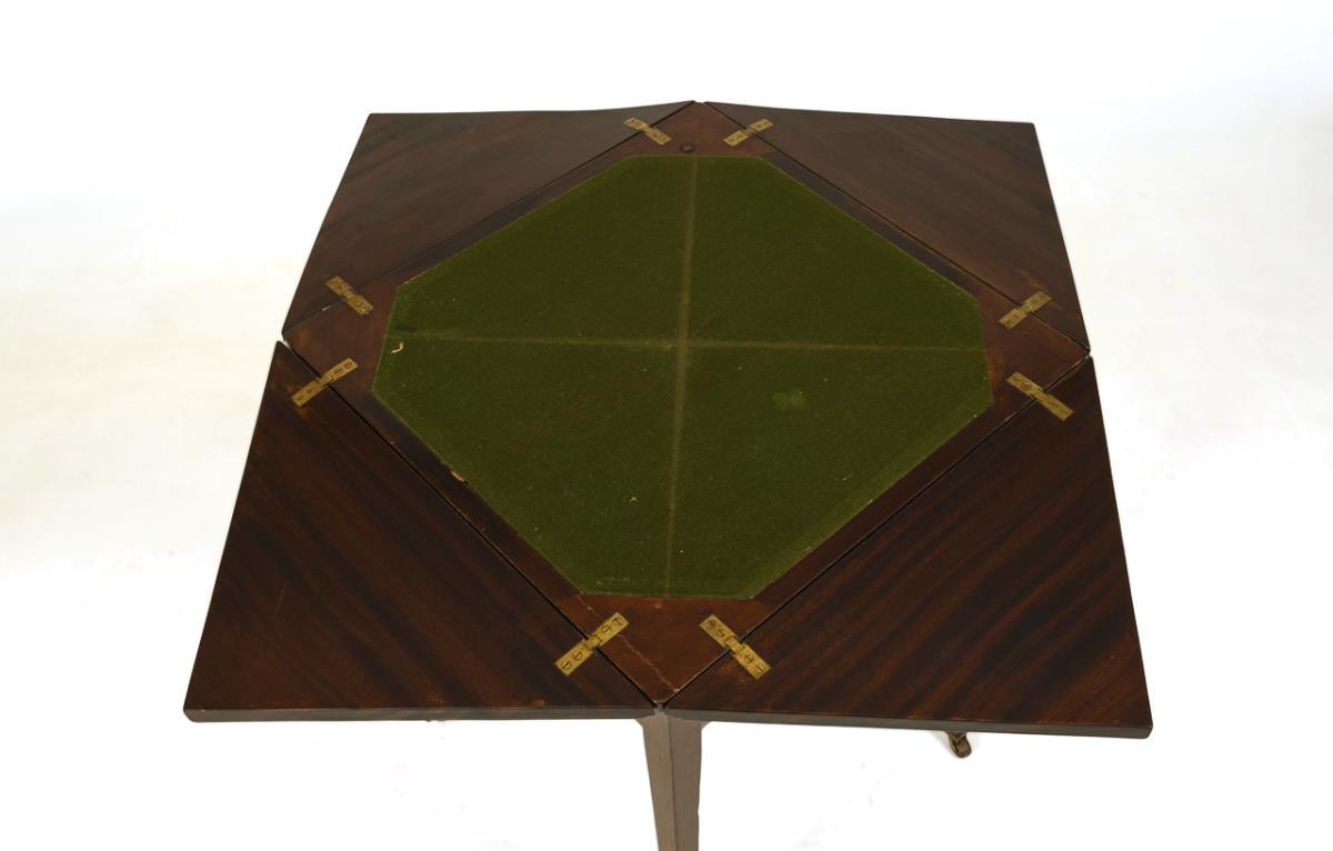 1-schübiger Tisch mit drehbarer und vierfach ausklappbarer Deckplatte, innen grüner Filzstoff in oktogonaler Form. Auf Spitzbeinen mit Rollenfüßchen. Messingbeschläge und -knäufe. Leichte Alters- und Gebrauchsspuren, partiell kleine Defekte, Deckplatten nicht ganz bündig schließend.