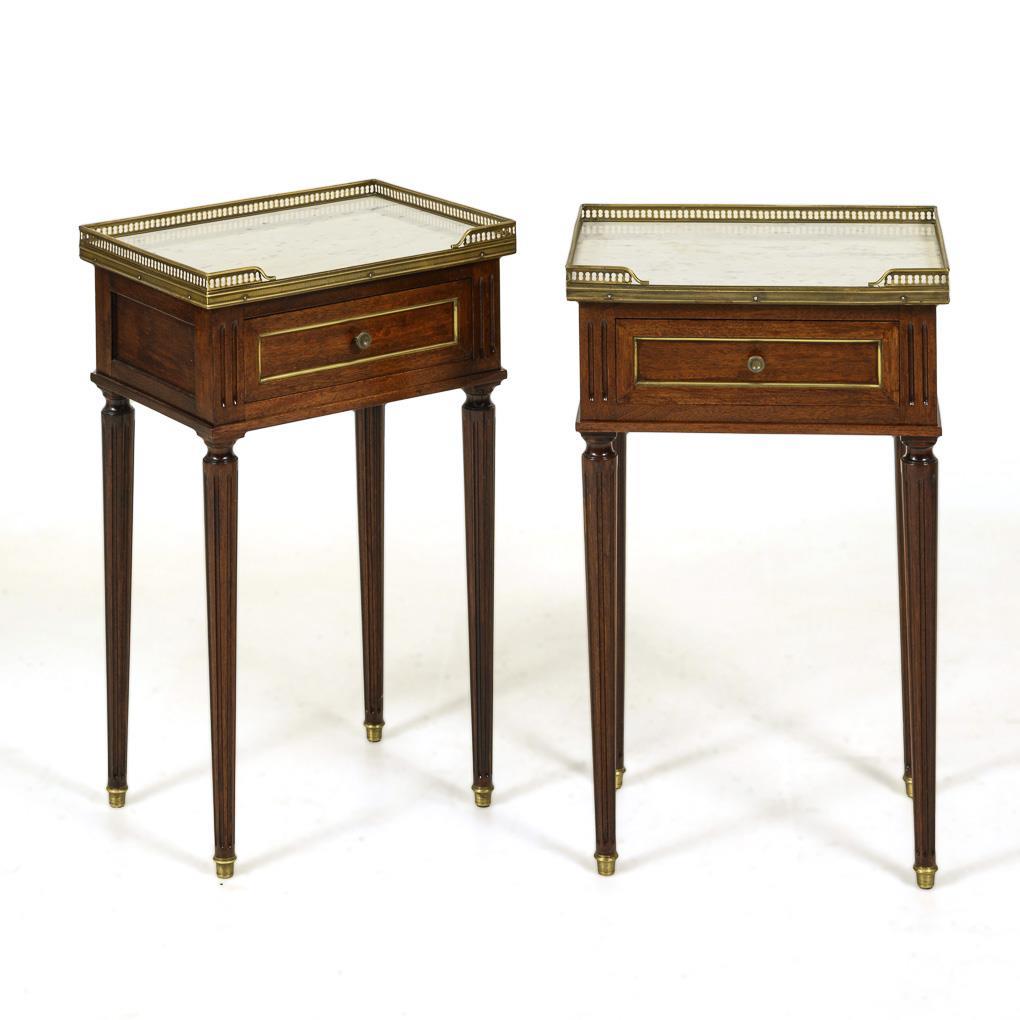 Jeweils 1-schübiger Korpus mit weißer Marmordeckplatte und perforierter Messinggalerie, kassettierter Zargenkasten, auf 4 konischen und kannelierten Säulenbeinen mit Messingfüßchen. Messing-Profilleisten und runder Messingknauf. Minimale Gebrauchsspuren.
