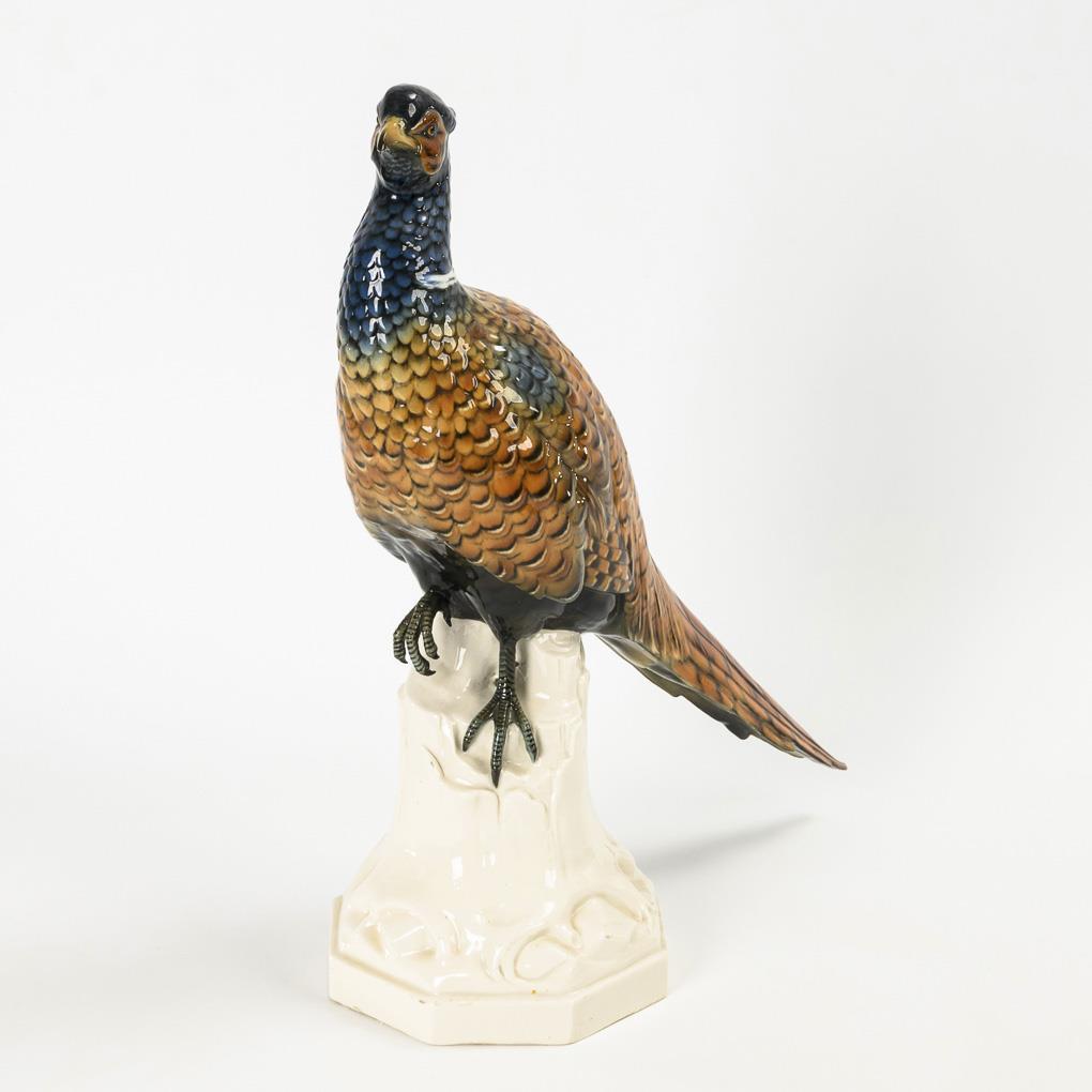 Auf einem Baumstamm sitzender Fasan. Schnabelspitze minimal bestoßen.