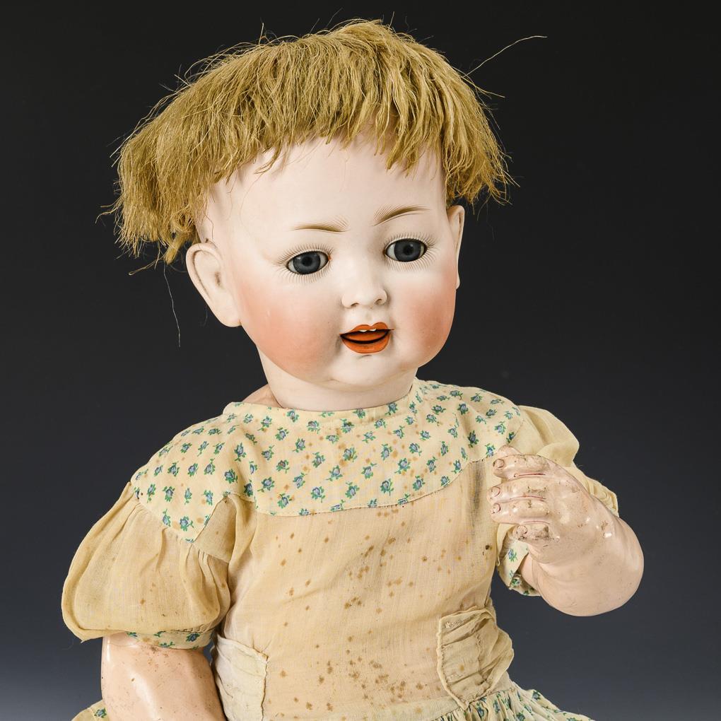 Kurbelkopf, blaue Schlafaugen, offener Mund mit Zunge, blonde Perücke. 5-teiliger Sitzbabykörper. Helles Kleid mit Streublümchenmuster. Kopf nicht durchleuchtet, Chip an der Halskurbel. Altersspuren, Kleid etwas stockfleckig.