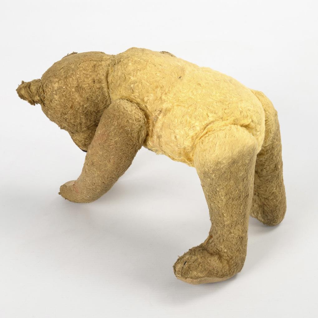 Steiff-Teddy aus blondem Kunstseidenplüsch, mit langen Armen, originalen Pfoten aus Stoff und grün gemusterter Hose, L 35 cm. / Kleiner gelber Teddy aus Kunstseidenplüsch, L 16,5 cm. / Gelber Mohair-Bär mit blauer Kleidung, L 36 cm. Alle bespielt, mit unterschiedlich starken Altersspuren.