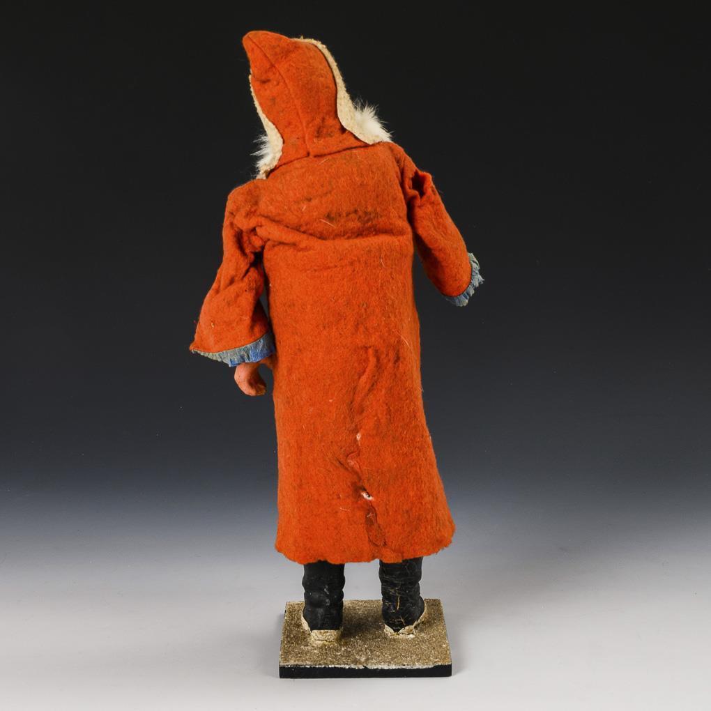 Weihnachtsmann mit rotem Mantel und weißem Bart aus echtem Fell. 1 Arm fehlt, Mantel innseitig nachträglich mit Papier verstärkt.