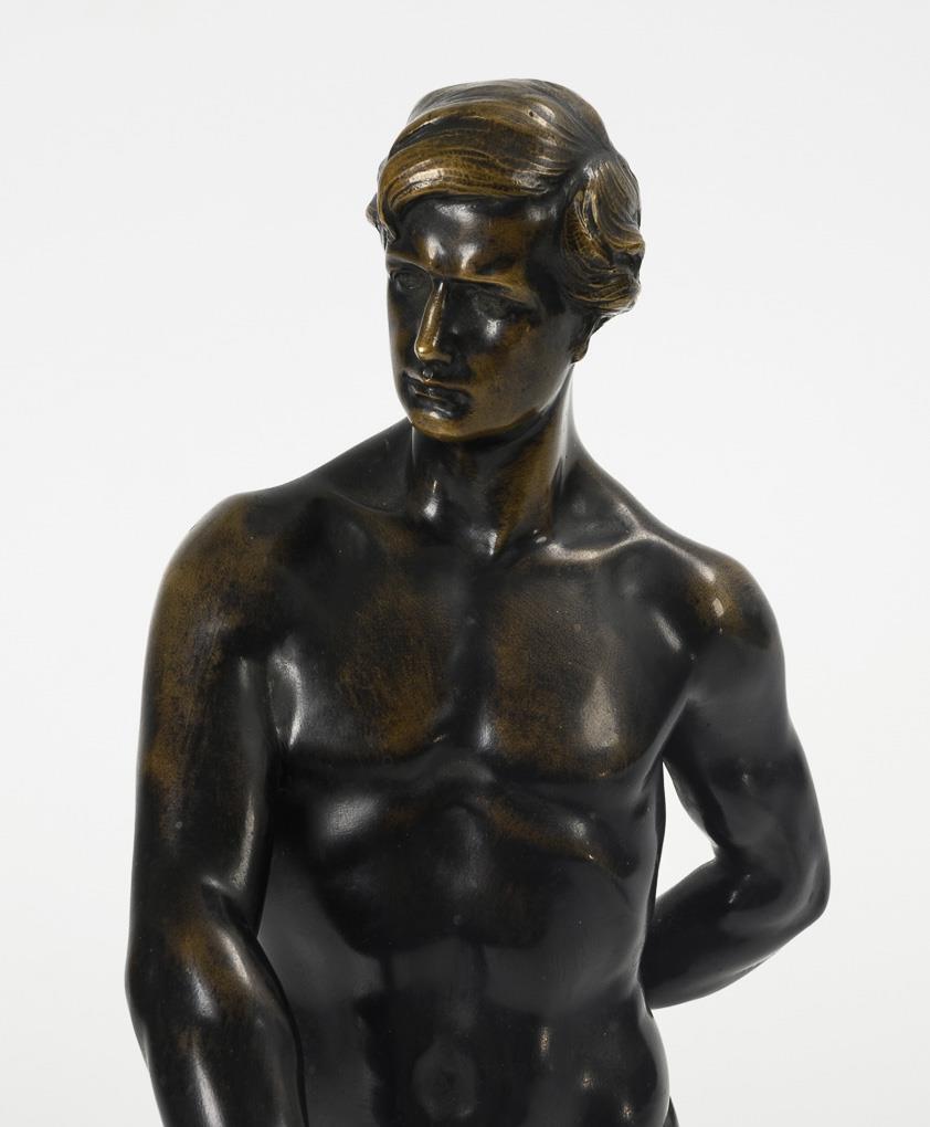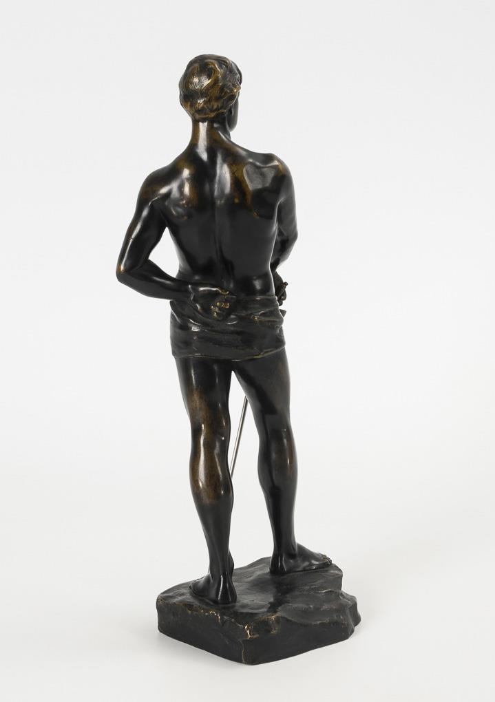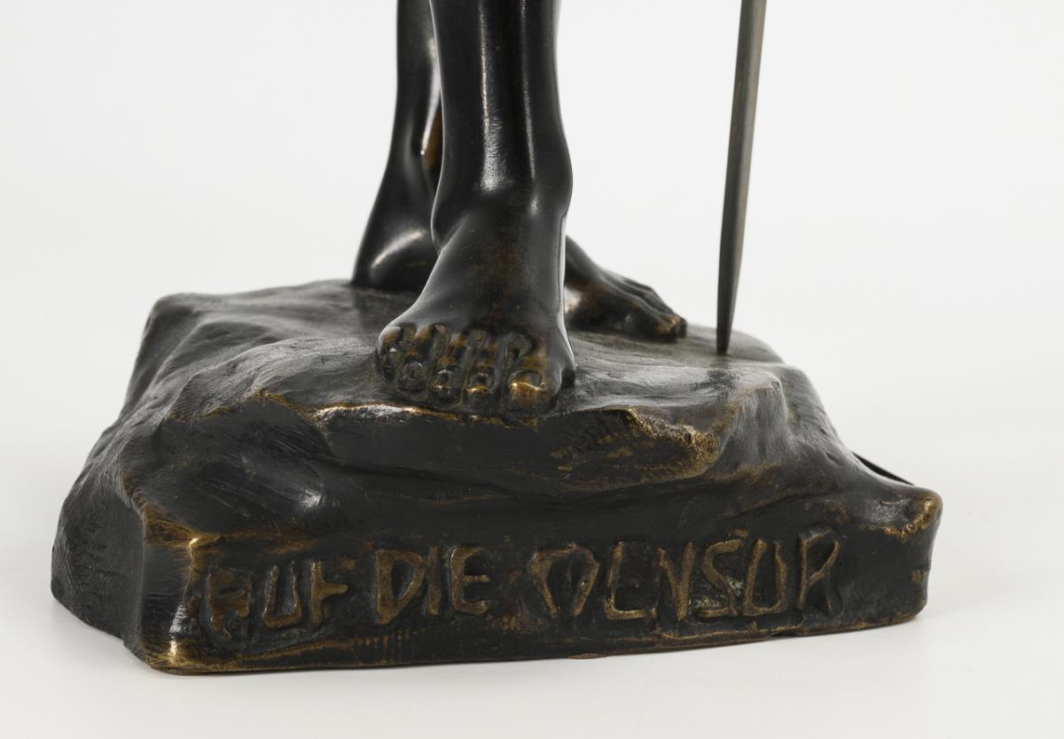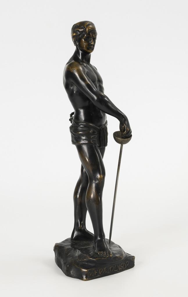 Bronze schwarz patiniert. Bezeichnet, an der Bronze-Plinthe betitelt sowie Metallschild mit Widmung von 1908 an den Vorsitzenden Dr. Friedmann vom Vorstand des M.R.V. H 40 cm. 4,6 kg.