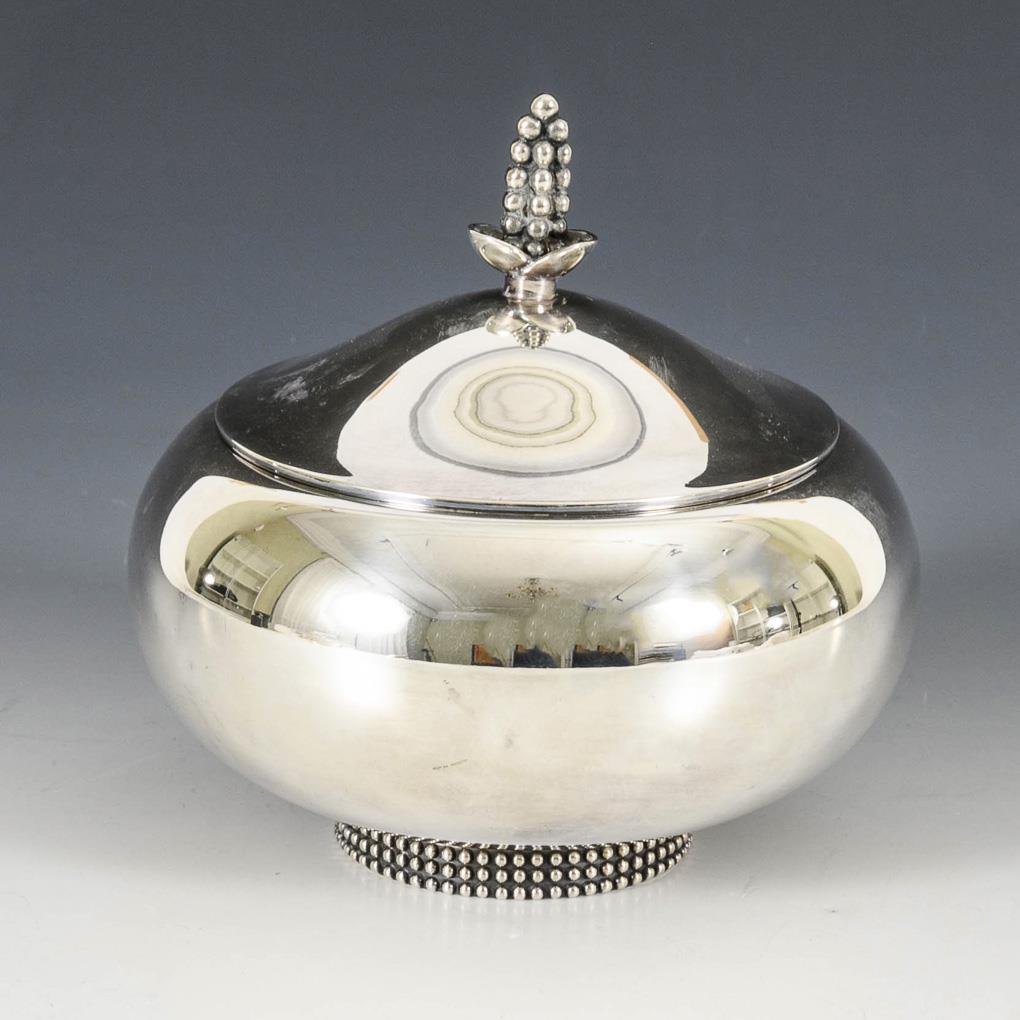 Bauchige Design-Dose mit Perldekor am Standring und plastischem Knauf. Kleine Delle am Korpus.