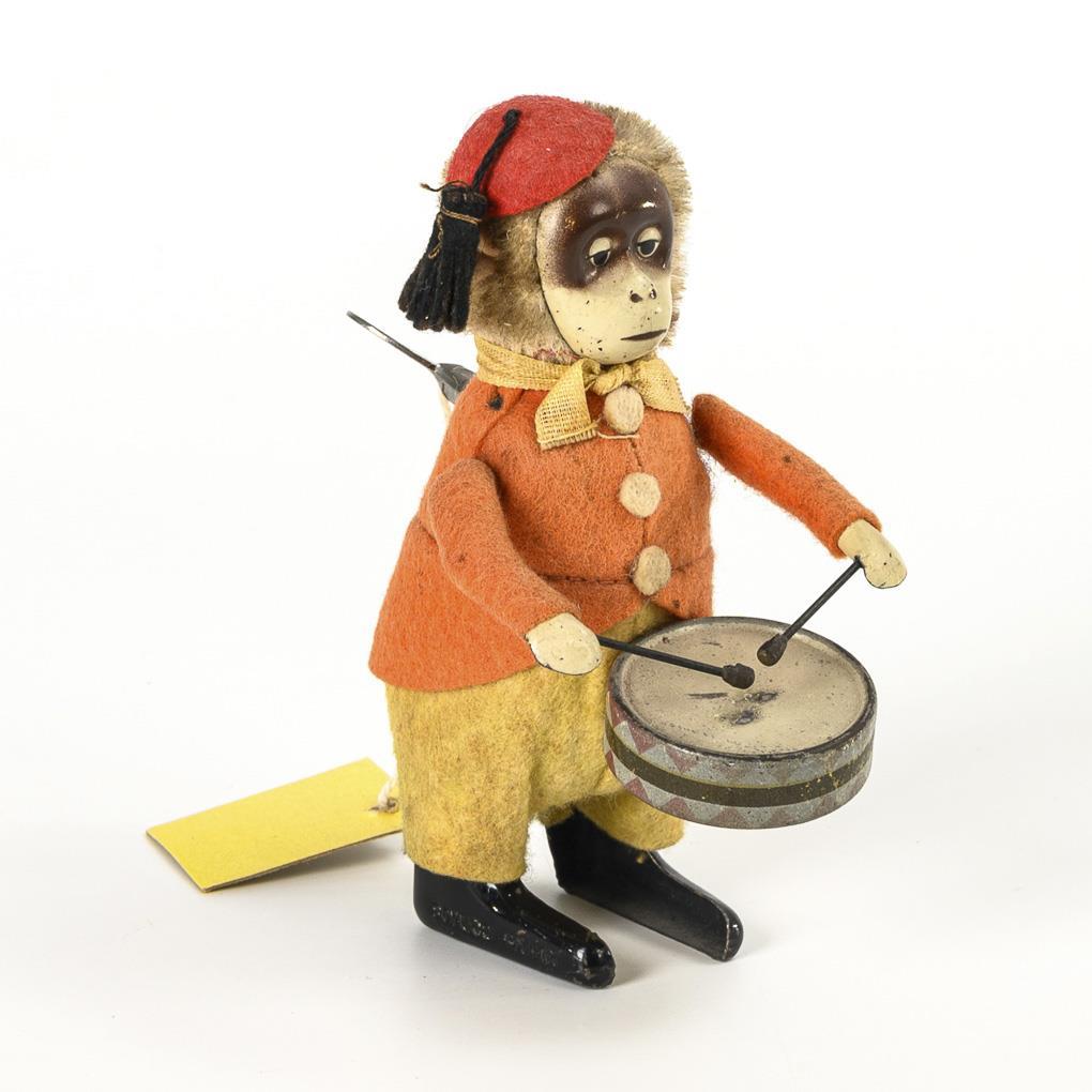 Kleiner Affe in Filzkleidung. Intaktes Werk, 1 Schlüssel. Leichte Altersspuren.