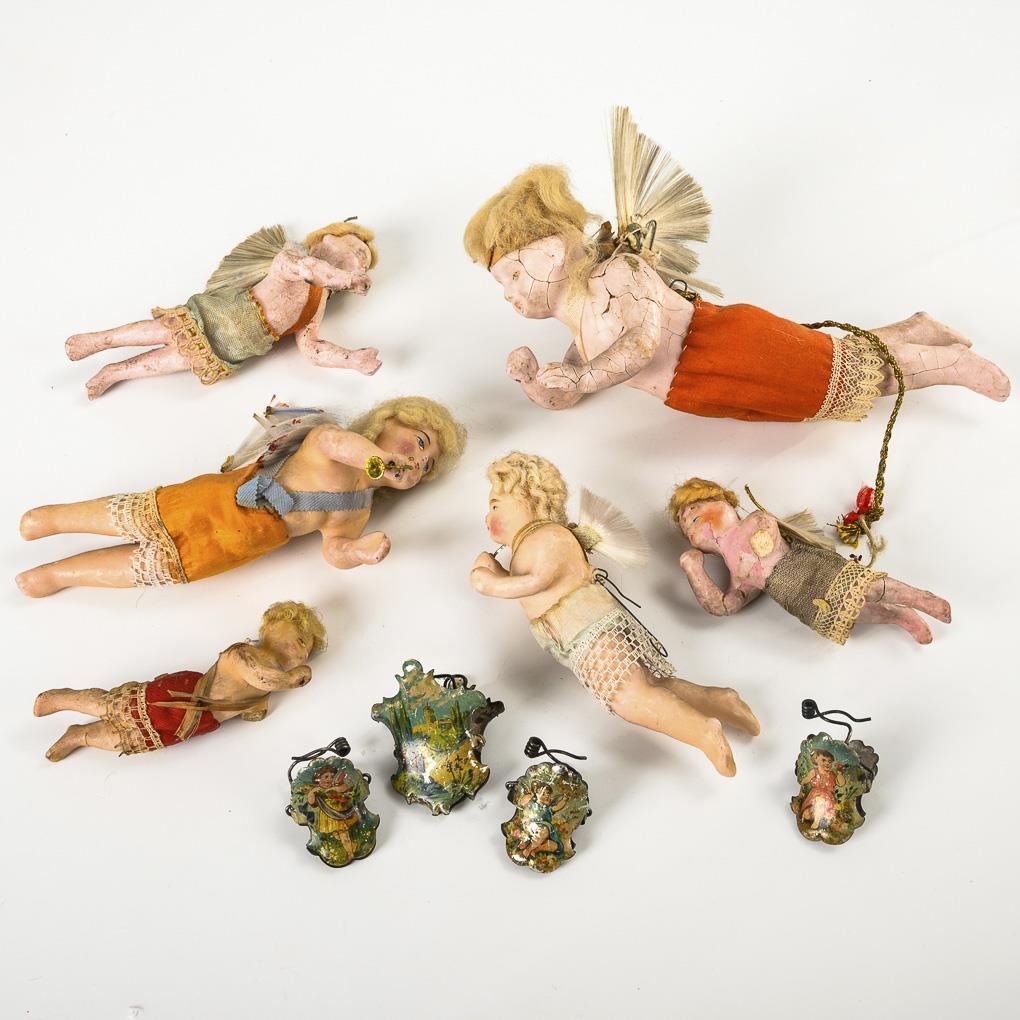 Schwebende Engelsfiguren mit Glasfaser-Flügeln. Als Zugabe 4 Blechklammern mit Litho-Dekor. Defekte, 2 Arme und Teile der Flügel fehlen, Altersspuren.