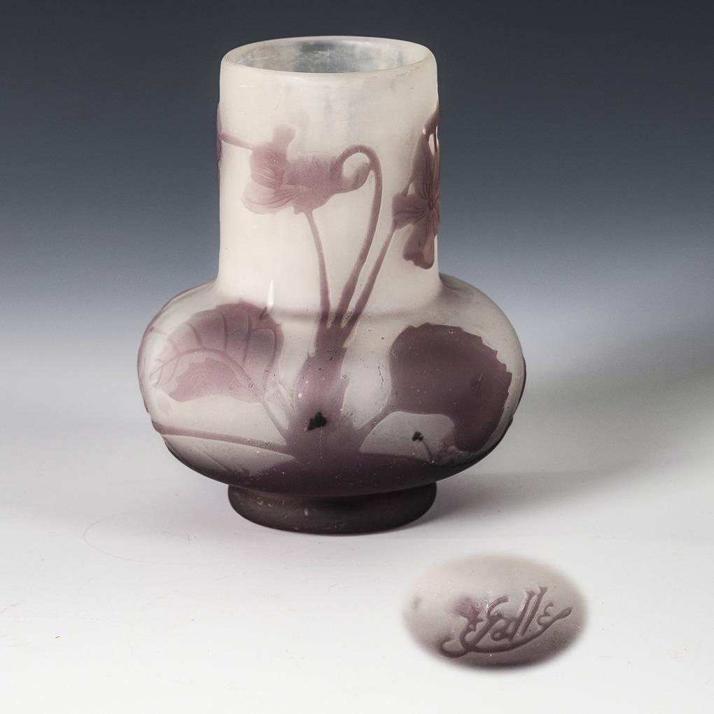 Vase mit gedrückt gebauchtem Korpus und Zylinderhals. Umlaufend geätztes Alpenveilchendekor; ausgekugelter Abriss.