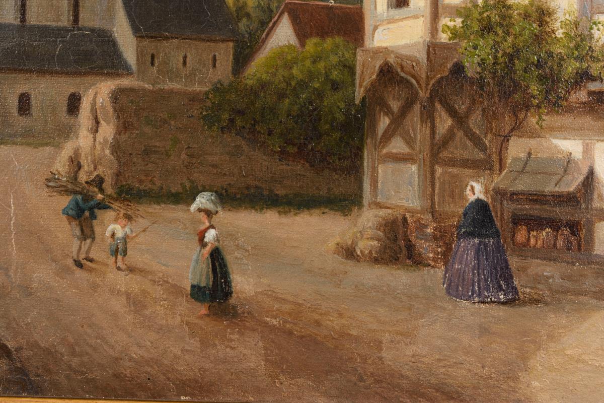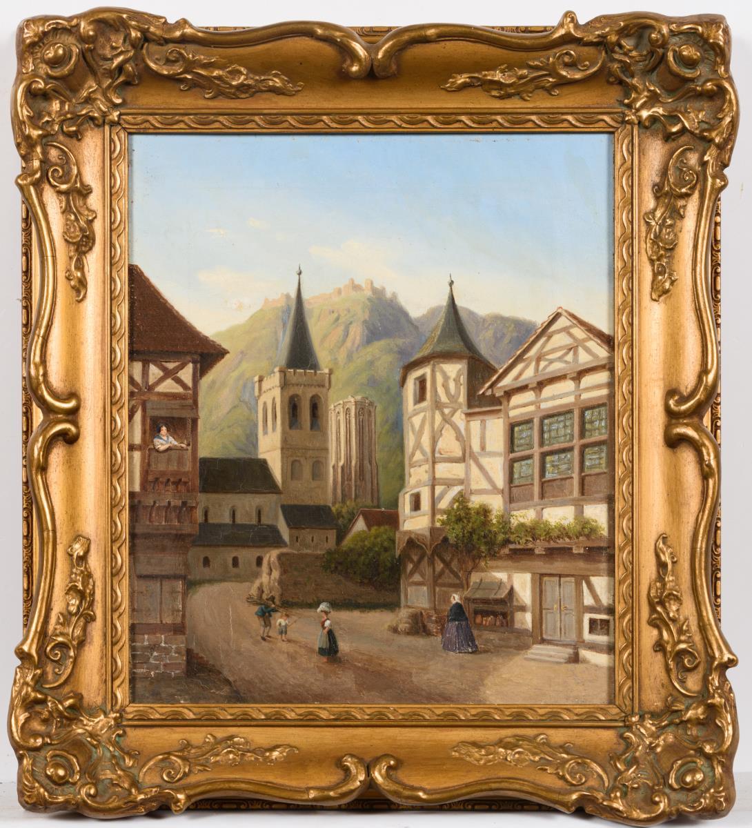 Staffagefiguren auf der Straße mit Blick zur Kirche, Kapelle sowie Burg in der Ferne. Minimale Altersspuren.