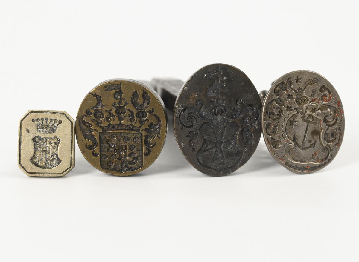 Silbersiegel in Barock-Form mit Wappen (Anker), bzw. abgeschraubter Metalltypar mit Wappen unter Freiherrenkrone, sowie 2 Wappensiegel. Wenige Alters-/Gebrauchsspuren.
