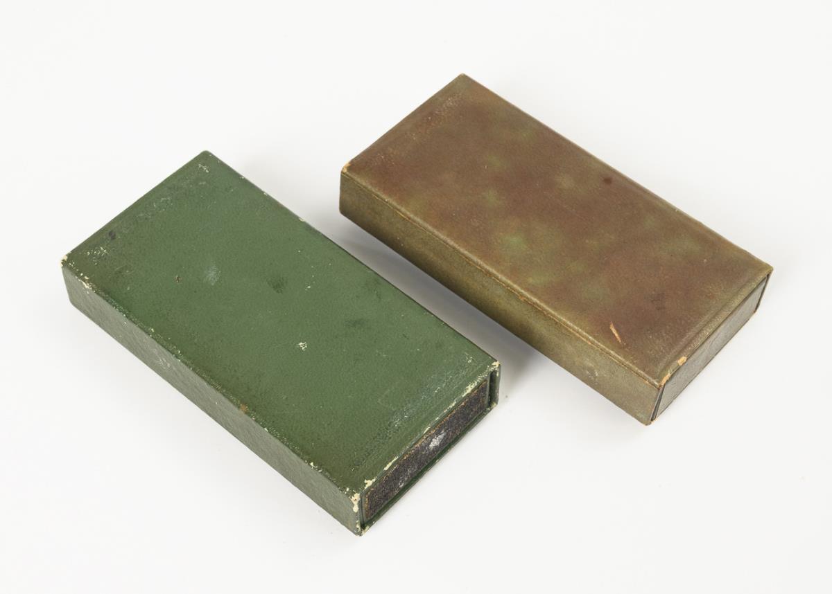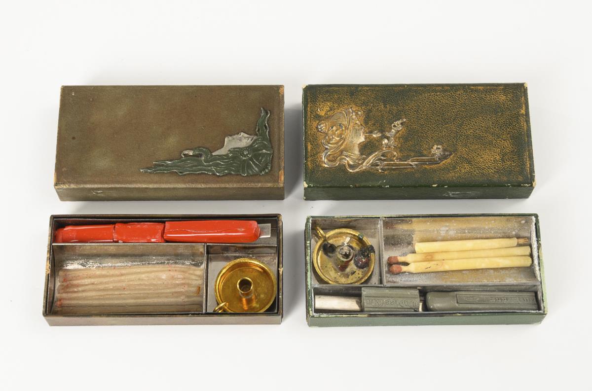 Schubschachteln mit Frauenkopf-Appliken und Reibeflächen an den Stirnseiten. Innen Fachung für Miniatur-Kerzenhalter und -kerzen mit Streichholz-Zündkopf sowie Siegellack. Geringe Alters-/Gebrauchsspuren.