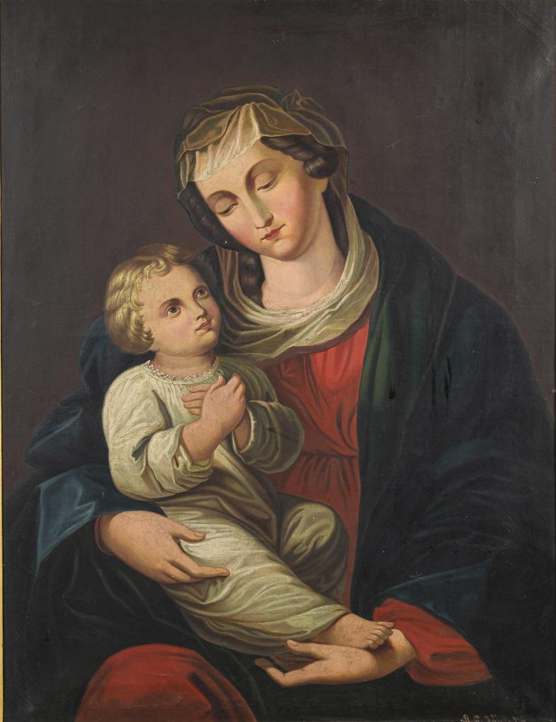 Der Jesusknabe im weißen Gewand auf dem Schoß und im Arm der Mutter. Altersspuren.