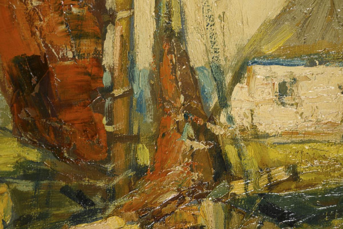 Die Boote an den Stegen nahe den Häusern und der Mühle unter wolkigem Himmel. Restauriert mit Hinterklebungen.