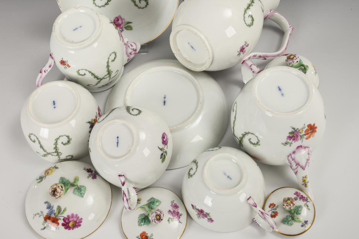 9 Teile. Modell "Neuglatt". Mit kleinen Blumenbukett, Streublümchen sowie dem aus Lorbeerranken geformten Buchstaben "K". Kaffeekännchen (H 17 cm), Teekännchen (H 9,5 cm), Milchkännchen (H 10 cm), Zuckerdose (H 9 cm), 2 Tassen (H 4,5 cm), 2 Untertassen (Ø 13 cm) und 1 Tablett (L 37 cm). Partiell Gold etwas berieben, Bestoßungen an den Blütenknäufen, Chip an 1 Untertassenrand, kleine Bestoßung an der Schneppe des Teekännchens.
