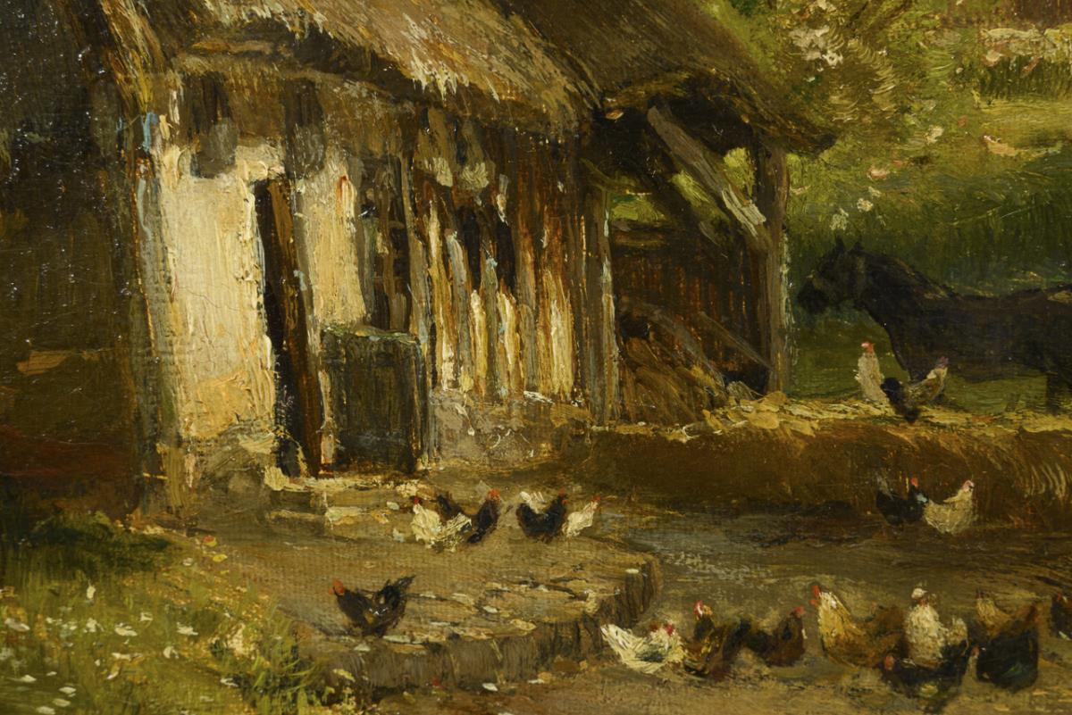 Reetgedeckte Kate mit blühendem Obstbaum und vielen Hühnern am Waldrand. Leichte Altersspuren.