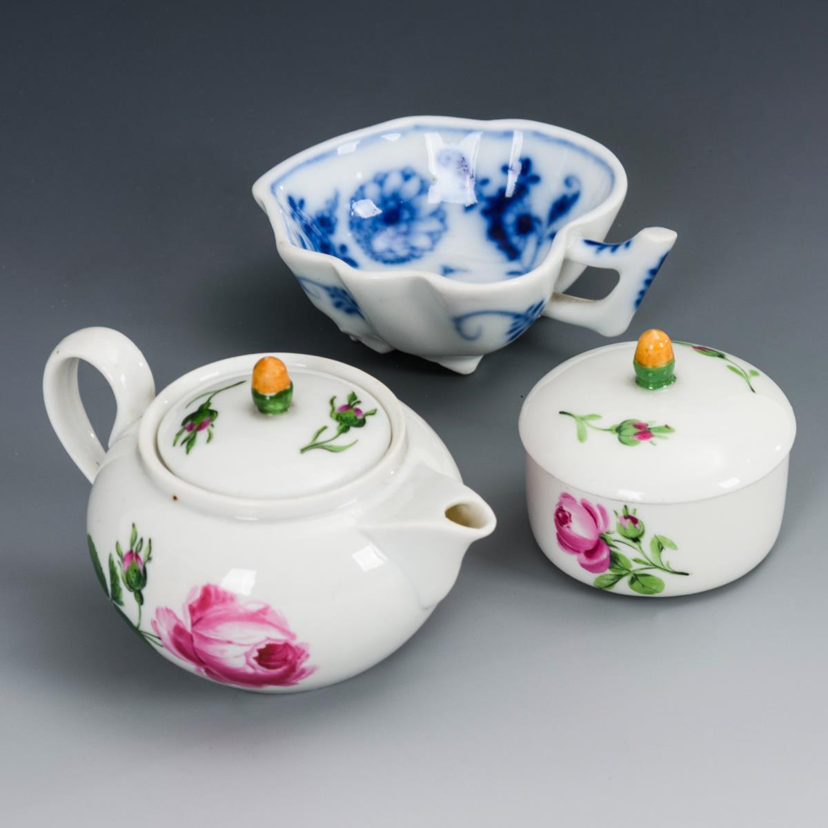 Teekännchen (H 6 cm) und Dose (H 4,5 cm) mit Rosenmalerei. / Zwiebelmuster-Blattschälchen (Ø 8,5 cm).