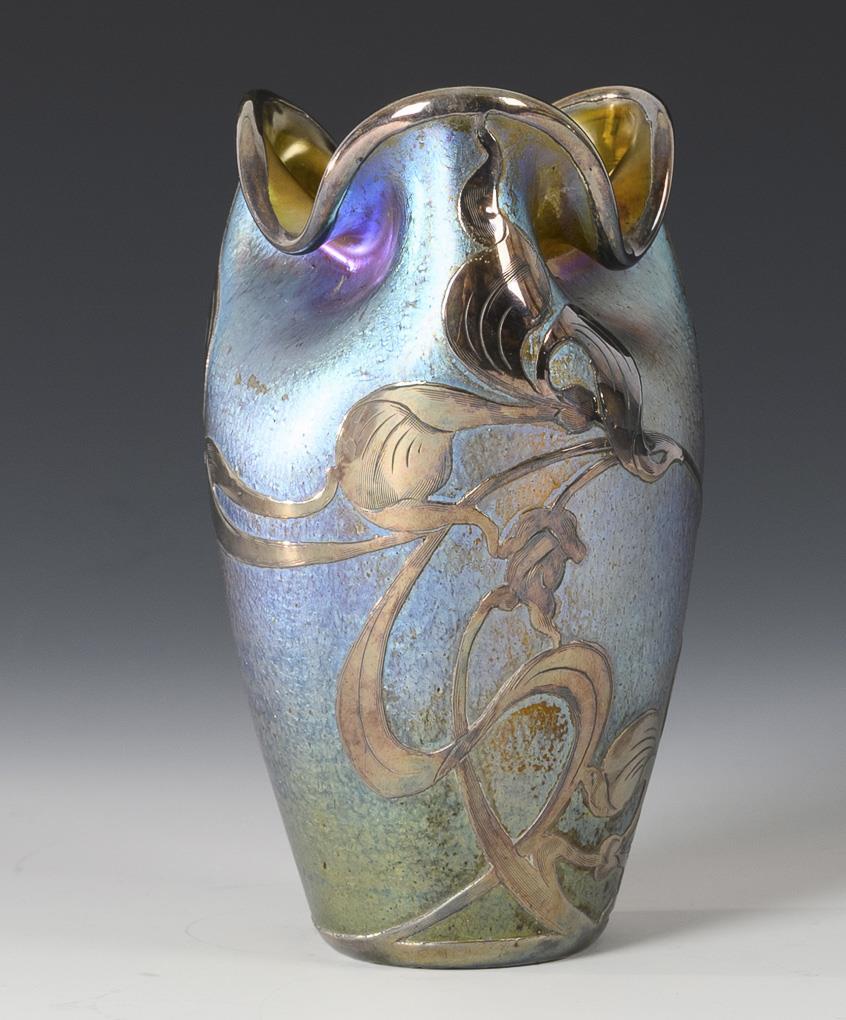 Kleine Jugendstil-Vase mit Silberoverlay. Lötz.