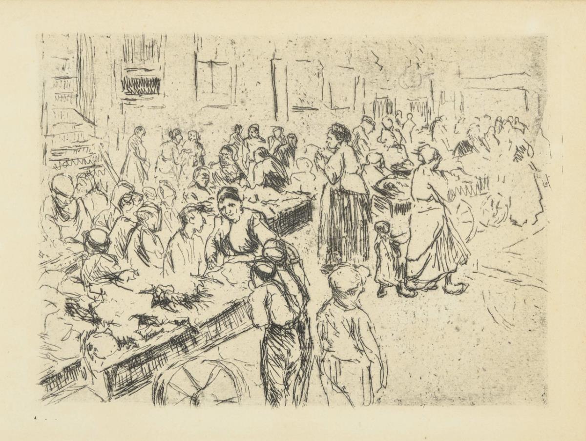 Ansicht eines Straßenzugs voller Menschen mit Karren, vor allem Frauen und Kinder. Wohl aus dem Buch: Hermann Struck: "Die Kunst des Radierens", mit 6 Original-Radierungen. Berlin, Cassirer, 1920. Unten links mit Bleistift "921-[...]".