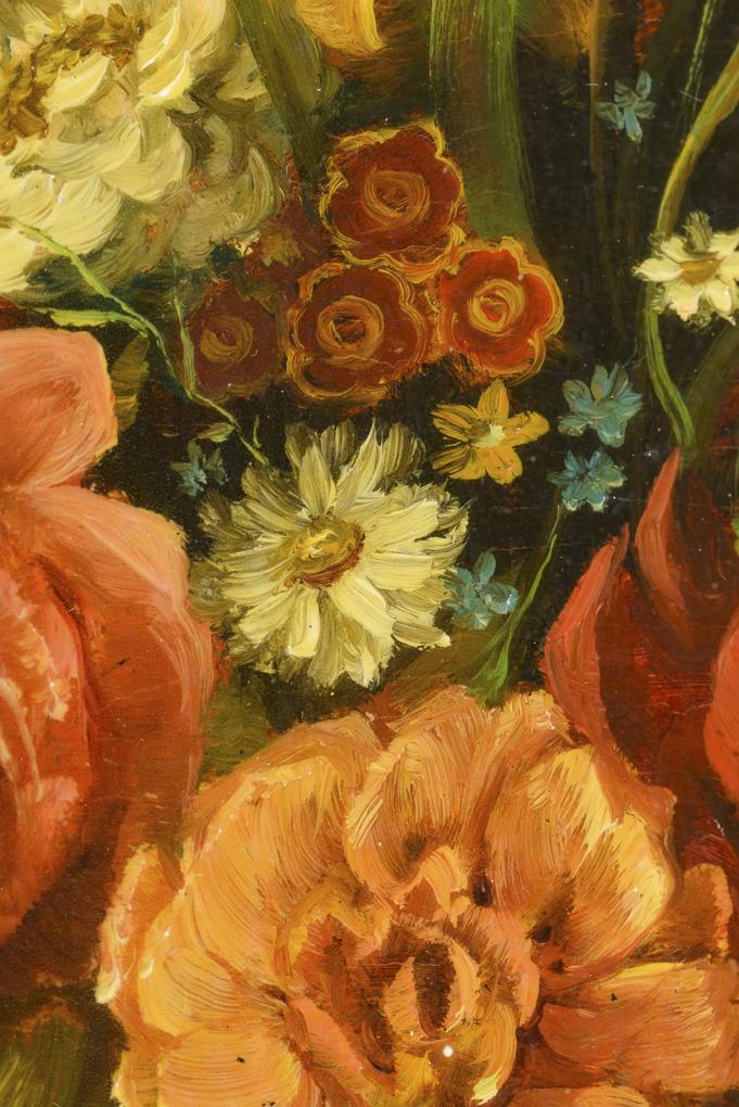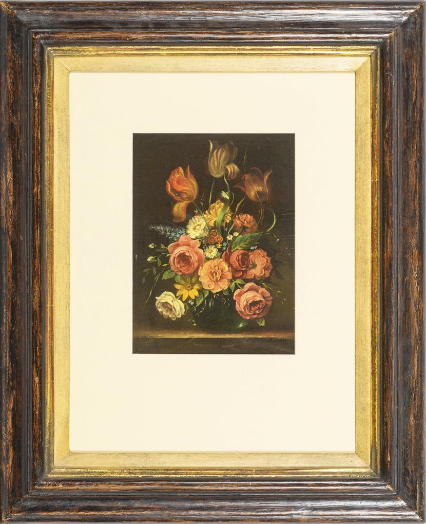 Altmeisterlich gemalter Blumenstrauß mit Tulpen und Rosen vor dunklem Hintergrund. Leichte Altersspuren.