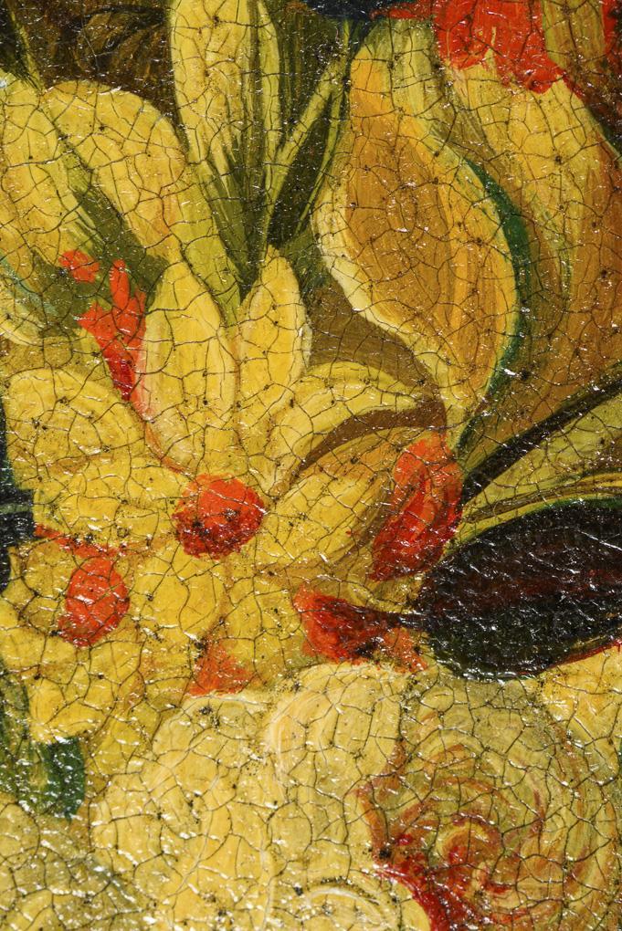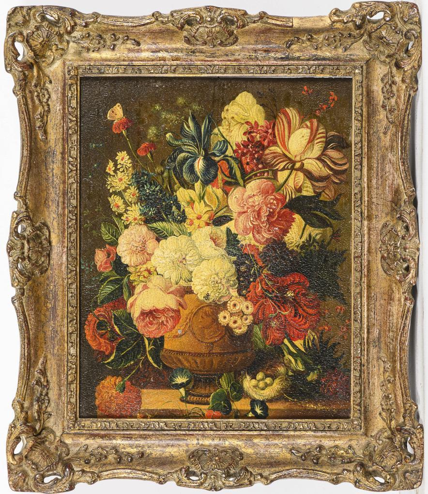 Im Stil der Altmeister gemalter Blumenstrauß in prunkvoller Vase auf einem Sims. Altersspuren.