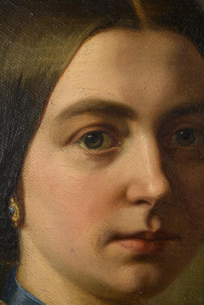 Porträt einer jungen Frau im schwarzen Kleid mit blauer Schleife und goldener Kette. Leichte Altersspuren.