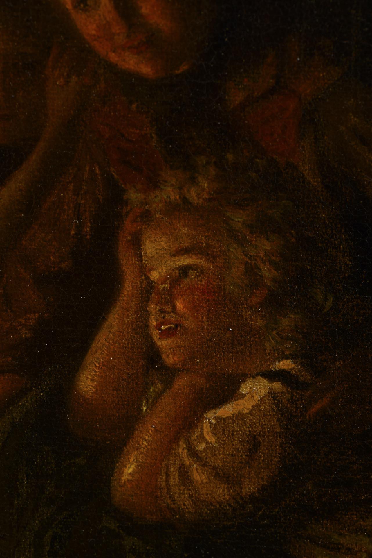 Genreszene mit Mutter und Kindern, welche im Schein des Feuers der Großmutter zuhören. Leichte Altersspuren.