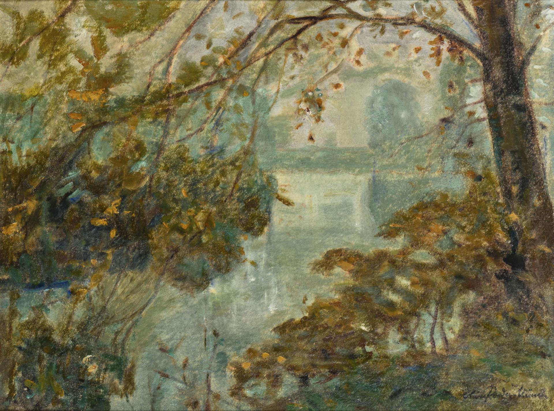 Herbstliche Bäume über dem Wasser in trüber Atmosphäre. Leichte Altersspuren.