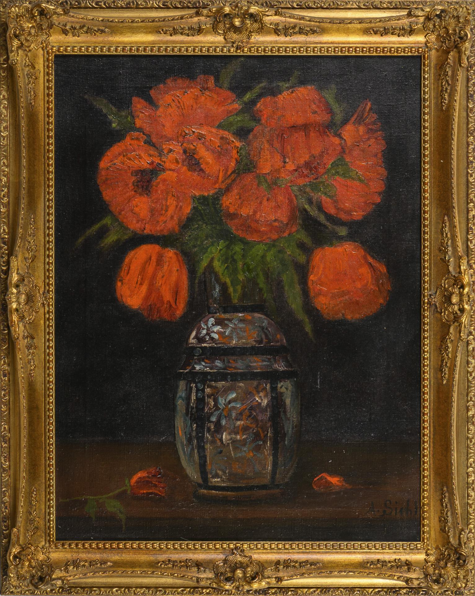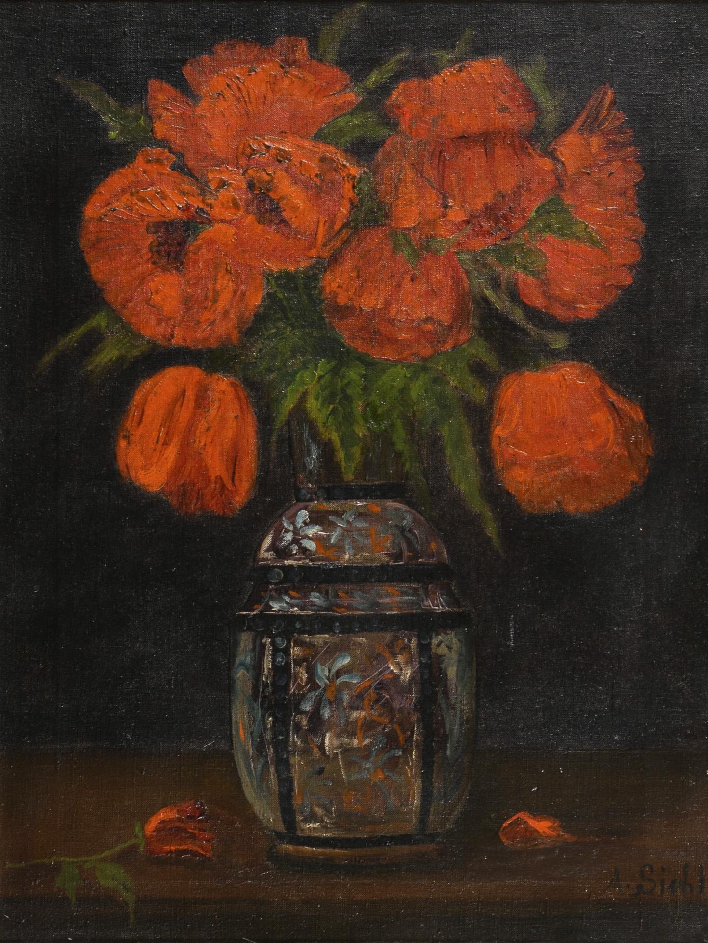 Mohnblumen in gemusterter Vase vor dunklem Hintergrund. Kleine restaurierte Stellen.