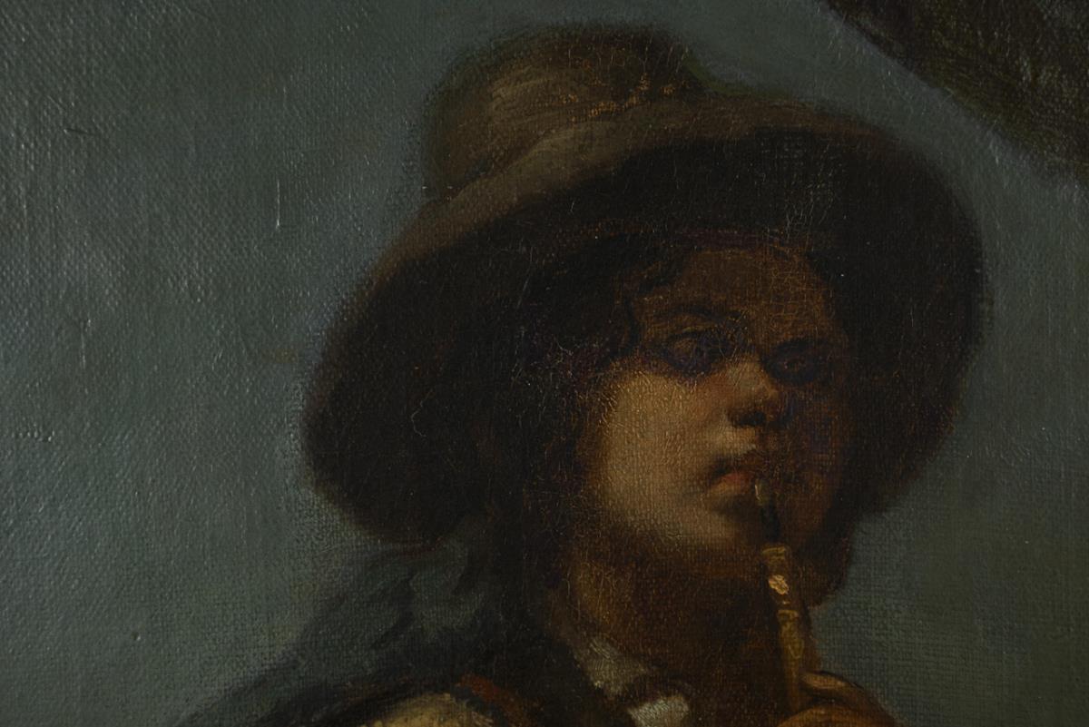 Junger Schäferbursche mit Mantel und Hut, neben einem Marterl im Gebirge die Flöte spielend. Leichte Altersspuren.