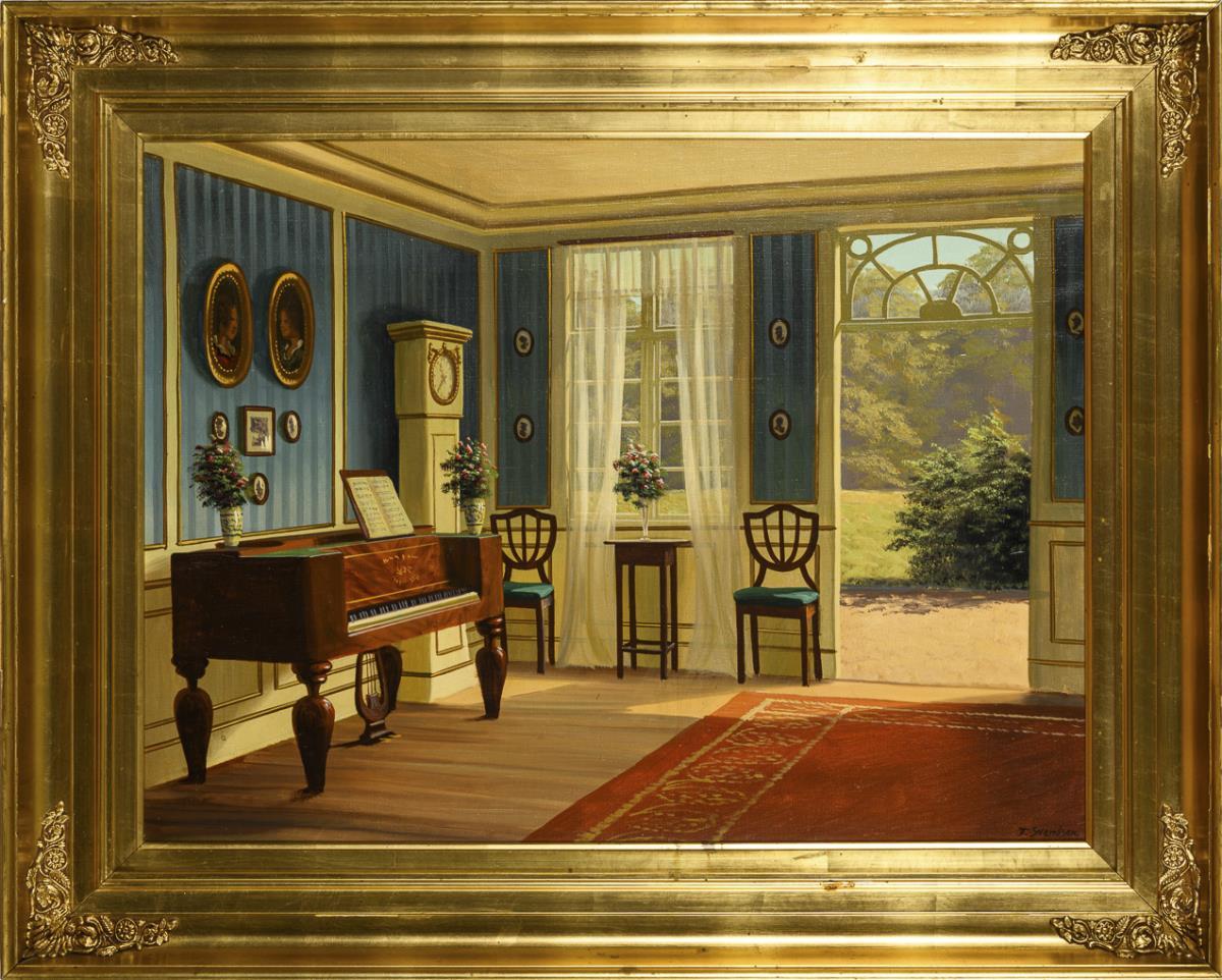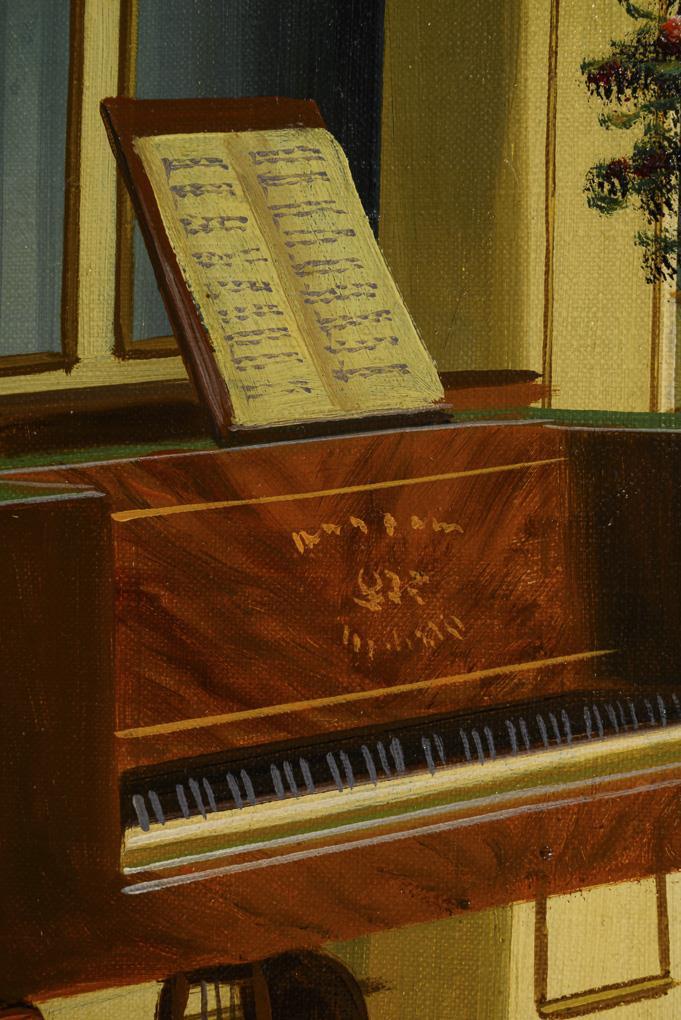 Bürgerliche Stube mit Klavier, Standuhr und Porträts sowie Scherenschnitten auf der gestreiften, blauen Tapete bei warm einfallendem Sonnenschein.