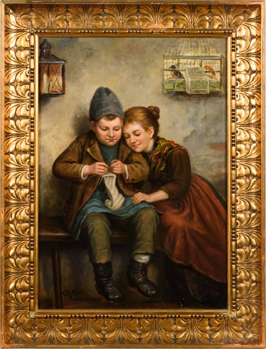Bruder und Schwester in der Stube beim Stricken. Eine kleine restaurierte Stelle.