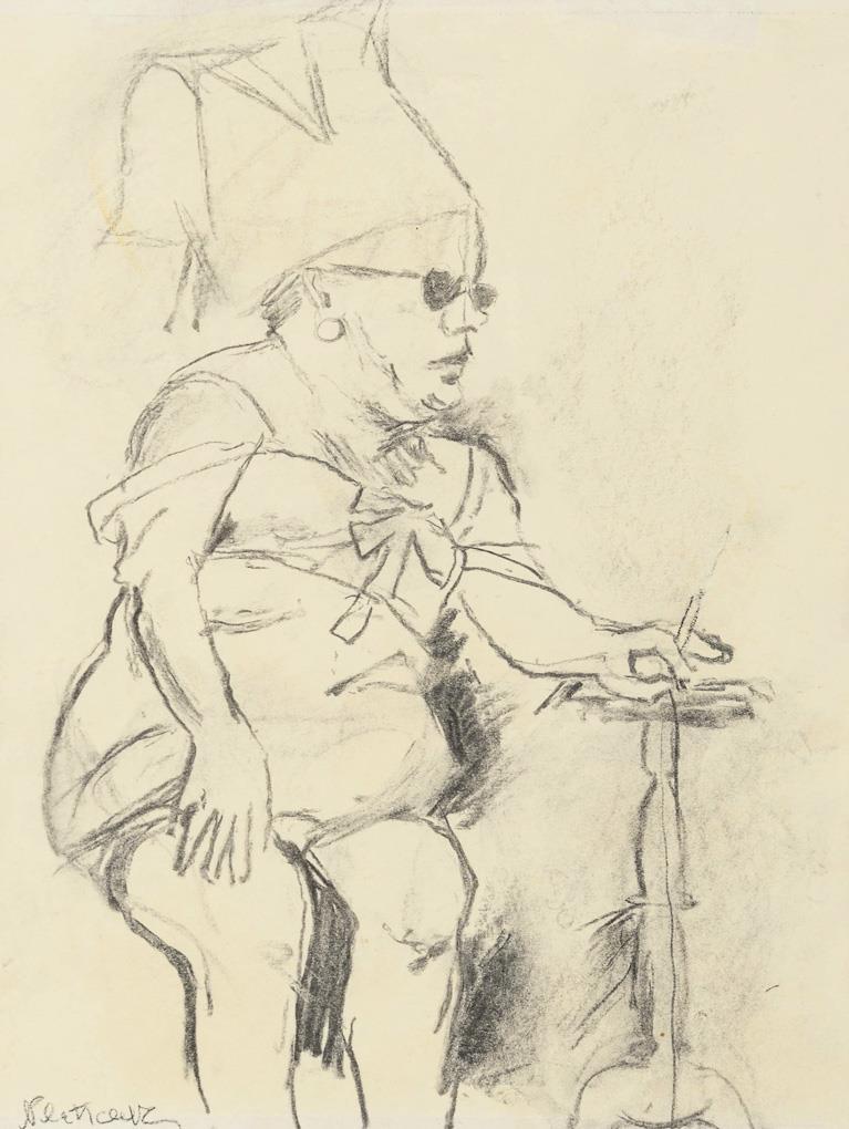 Zeichnung einer sitzenden Dame mit Hut und Sonnenbrille, in ihrer linken Hand eine Zigarette.
