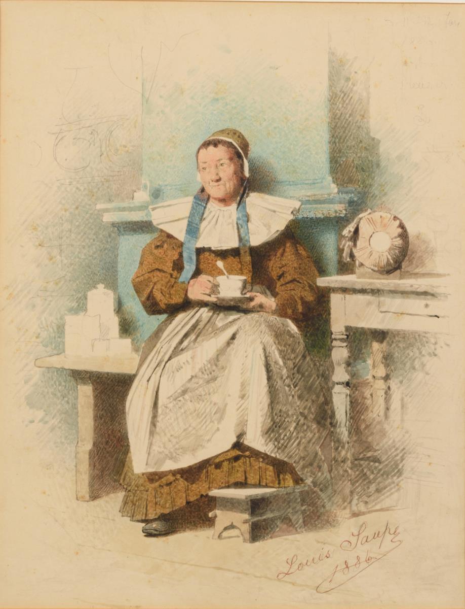 Porträt einer älteren Frau mit Kaffeetasse am Kamin in der Stube sowie Bildnis eines älteren Tischlers bei der Pause. Je leichte Altersspuren.